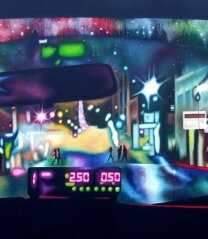Charles Baudelaire in 1863 called for painters to focus on ‘depicting the fast-changing landscapes of life’, and described such an artist as ‘The Painter of Modern Life’: it is clear that within her varied series of works, capturing such modernity is something that Andrea Tyrimos achieves. Her vibrant, neon paintings represent a nocturnal narrative flow. Some of the pieces are concerned with giving artificial lights physical substance, whilst others present a historical trajectory. The paintings are as much to do with the physical medium of paint itself as the intangibility of the light this medium attempts to reproduce.